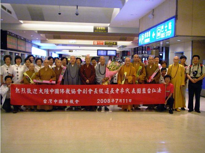代表团系于今(2008)年7月11日下午五时十五分搭乘华航班机抵台,该会为表崇敬与欢迎,理事长净良长老特率同两岸佛教交流委员会主任委员妙元法师,及网站执行长坚如法师进入停机坪匣口候迎。当华航班机准时降落,并滑行停于机坪后,即见根通长老等一行人随著乘客鱼贯走出匣口,净良长老等人即趋前接驾,由于这次来台的几位团员系安虎生总干事推介与促成的,所以净良长老一见到身材壮大的安总走出匣口,尤感兴奋,为表万分感谢,特请团员们与迎接者于落地窗口合影留念,然后领著大家徐步而行,并受到机场人员的礼遇通关。