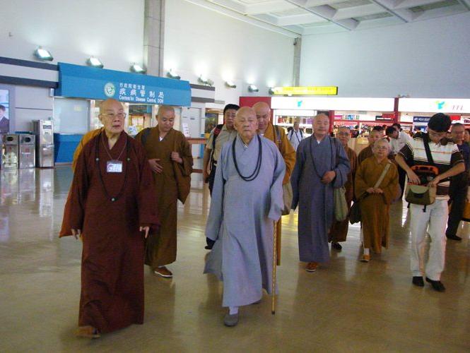 一行人认领行李后,即行出迎宾大厅左侧,受到该会理事明空法师、台北县佛教会常务理事宏宗法师及常行、宗慧法师等人的献花与热烈的欢迎。在高张的气围中,大家兴高彩烈地排列于“热烈欢迎中国佛教协会副会长根通长老率团来台弘法”的横批红布条后合影留念,然后分别搭乘七部自用小客车前往接受宏宗法师假桃园富薆素食餐厅为代表团设宴接风洗尘。由于净良长老体恤大陆代表团员们上午四时即起床前往机场搭机,一路奔波的劳顿,用完餐后,即原车护送代表团们入住台北圆山大饭店休息,以待明(12)天上午出席论坛的开幕盛典。
