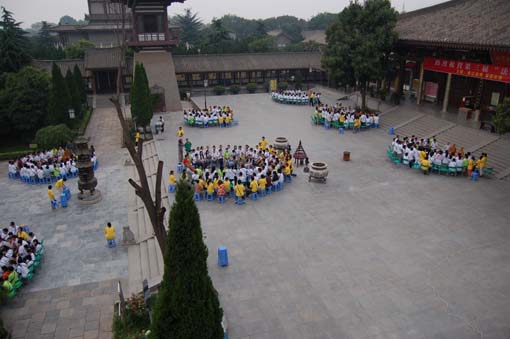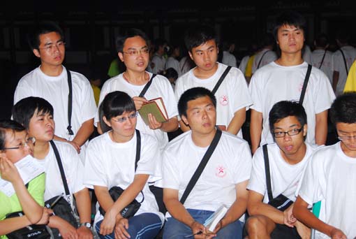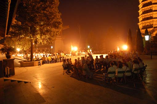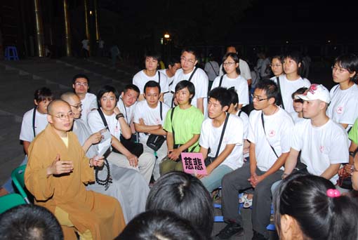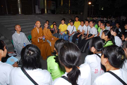 19时30分,大雄宝殿前广场上,在各负责法师的带领下,学员们分组与法师近距离接触探讨佛法。在轻松、愉快的氛围中,学员们与法师就学习及生活中存在的问题互相交流。
