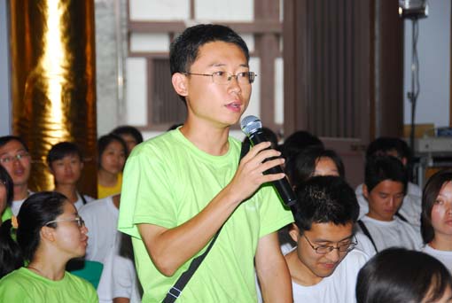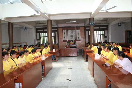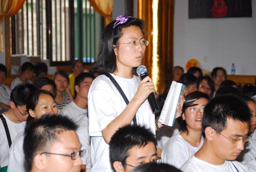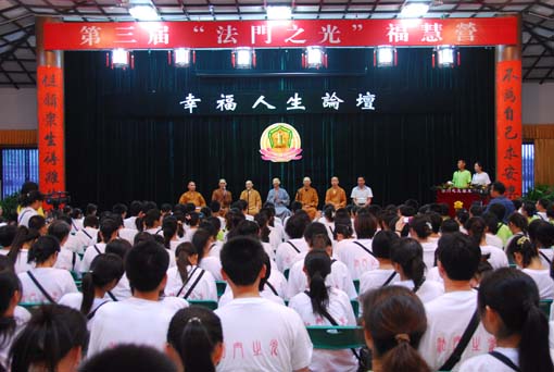 晚上7时30分,法堂里学员满座,气氛热烈,一场关于“幸福人生”的大讨论在学员提问与法师回答的形式下展开,智超法师、贤空法师、慧超法师、道伟法师、宽军法师、慧慈法师、李利安教授等用慈悲的胸怀和睿智的语言向学员们开示了关于人生幸福的真谛。