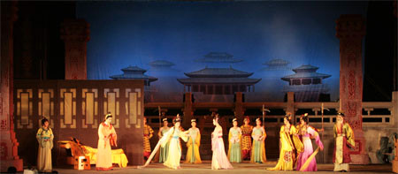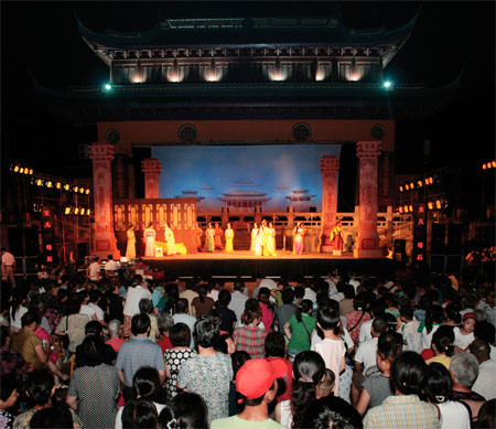 在天宁宝塔前的广场上搭起的演出台与天宁寺的建筑溶为一体,让人有一种几近真实之感。《观音前传》讲述了贵为皇家三公主的妙善乐善好施,救父成道的故事。通过锡剧这一传统戏曲的演绎,旨在揭开披在观音身上的神秘纱布,让她从佛殿的莲花台上走下来,走上戏台,走向人间,让人们从中吸取有益的教化。