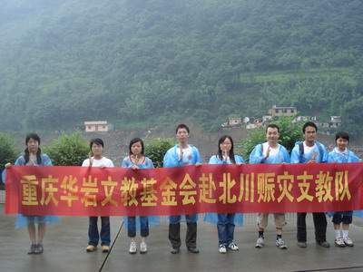 灾区援建,知识先行。为有力支援灾区的文化建设,重庆华岩文教基金会主办灾区学子支教赈灾项目,并获得西南政法大学、四川外语学院支教小组协办。支教队由西南政法大学博士生蒋海松同学发起,首批队员由主要由西南政法大学、四川外语学院等学校的高校师生组成,主要多系博士,硕士等高层次人才,支教的对象涉及中学、小学和学前班,开设的课程包括中小学语文、英语、历史、歌舞、心理辅导、指导联欢晚会、幼儿的三字经等蒙学教育和童话故事教育等。支教队自7月25日夜晚到达陈家坝以来,第二天清晨即投入到紧张的支教工作中。到笔者发稿时为止,支教队员还在灾区进行各种支教和赈灾工作,并且所有人都平安健康。支教队将一直工作到八月中上旬学校放假时撤回。