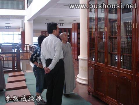 在藏经楼,秘书长认为这里的设备、建筑很好,如九品莲采光井设计的很省电节能。见到樟木雕刻的观世音菩萨像,非常欢喜并照相留影。对于满架玲琅的经卷赞叹都是好书,妙师父告知这里放有大藏经。