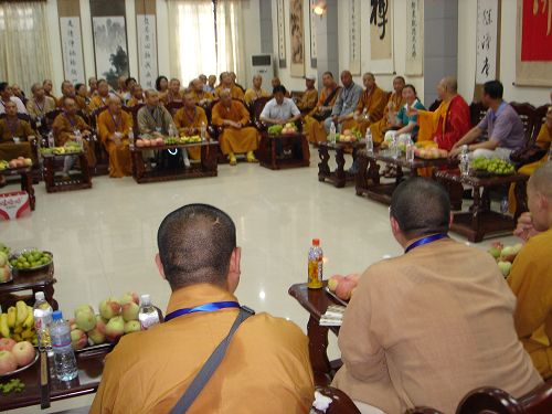 参观结束麓山寺方丈圣辉大和尚在寺院的方丈室亲自迎接来湘访问团一行人。在接待室,圣辉大和尚给访问团介绍了麓山寺的历史,受到访问团的热烈称赞。