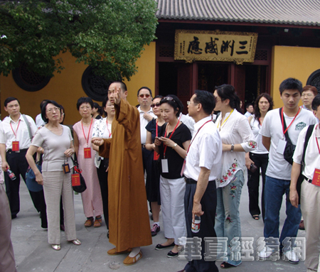 杭州净慈禅寺的法师在向台湾学者做介绍