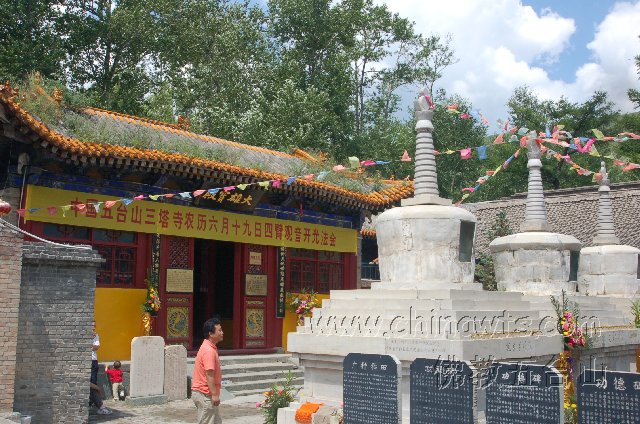 三塔寺位于鹫峰之,紧邻五台山名刹大显通寺,于大白塔毗邻,周围遍布佛塔寺庙。该寺建于明代万历年间,由我国历史上禅宗高僧了尘施工建造。神宗之母李艳妃多次亲往朝拜,巍巍然三座古塔便是明代帝王嫔妃礼拜后所赐赠建造。大清年间,从宁波而来的一代高僧贡嘎上师支持黄教领袖寺庙菩萨顶后,又将三塔寺修葺一新,三塔寺便成为五台山黄教道场,并深受康熙、雍正两位皇帝重视。一九八六年,照圆法师开始住持该寺。当时,十年动乱刚刚过去,寺院甚是破败,照圆法师便与僧众在原址上复建殿宇僧舍,补充塑造佛像,现在已经初步形成一处显密并研的庄严道场。在这里修习佛典、焚香礼佛,或旅游观光,都可以得到一种特殊的宁静和少有的清雅。