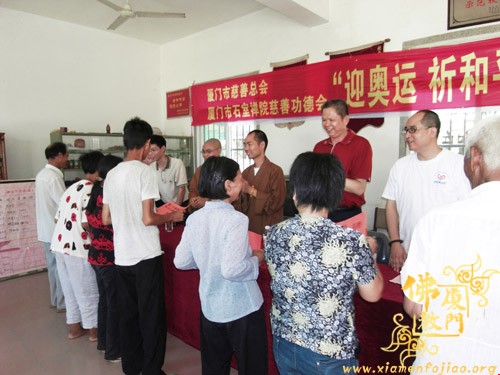 此番和谐之音,奏响于当日下午3:30厦门市翔安区新店,由厦门市慈善总会蔡秘书长和厦门市石室禅院慈善功德会会长忠明法师领衔,八位接受捐赠的代表亲临现场,新闻记者、禅院法师、慈善总会、功德会及老年活动中心的工作人员等六十余人共同谱写了一曲美妙的人间和谐之音。