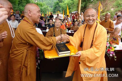 奠基庆典结束后,还举行了显密藏经互赠仪式,彭州三昧禅林向台湾佛光会赠送了《洪武南藏》,而台湾佛光会则向三昧禅林赠送了《佛光大藏经》,众皆欢喜无限。
