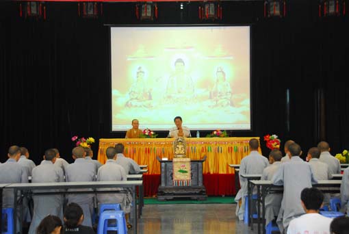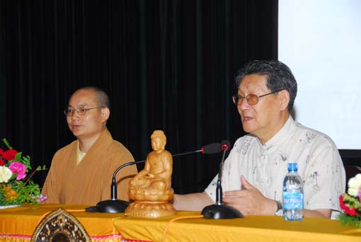 讲座中,他谈到,佛教文化是传统文化中最活跃的文化,传统文化是由儒释道三足鼎立支撑着的,这三者和睦相处共同构成中国的传统文化。你中有我,我中有你,但你又是你,我又是我。在发展的潮流中,各自又保持着原有的特色。而佛教的立足是最坚实的,既有载体,又最具实力。因佛教的包容性,在传入中国的过程中,自然地融入了儒家和道家的思想。的确,传统的说法,以儒治国,以道治身,以佛治心。 所以,传统文化的弘扬和发展主要得依靠佛教。出家人不仅要继承和发扬佛教文化,还要传承和发扬整个中国传统文化。前任佛教协会会长赵朴老在20多年前就呼吁:佛教的任务首要是人才培养,第二是人才培养,第三还是人才培养。