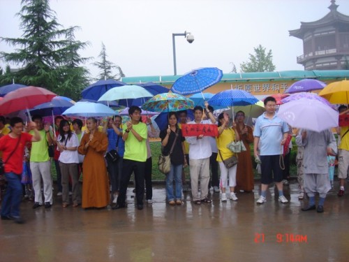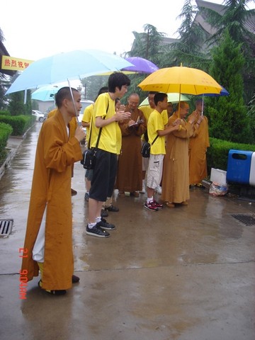 从昨晚联欢晚会结束到今日,天空一直下着蒙蒙细雨,漫天飞舞,如云如雾,似乎在诉说这送别的忧伤,分离的凄苦,更像是大慈的佛陀、观世音菩萨悲悯众生,遍洒甘露法雨,润泽苍生!义工们纷纷搭起“伞桥”欢送离营的学员们。
