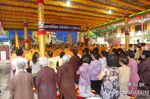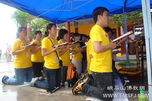 台湾佛光会中华总会的法师、居士以及彭州三昧禅林常住法师、周边信士等数百人参加了此次法会。众等虔诚,慈音和合,以此功德,回向灾区同胞,愿逝者往生净土,莲品增上;生者身心康泰,增福延祥!