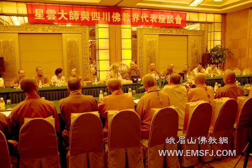 7月22日,台湾佛光山星云大师一行与四川省佛教界代表在成都锦江宾馆举行佛学交流座谈会。四川省佛教协会会长永寿法师、副会长大恩法师、素全法师、宗性法师、广成法师、意寂法师、素慧法师、如意法师、秘书长王立军及四川各大寺院执事代表等参加了座谈会。