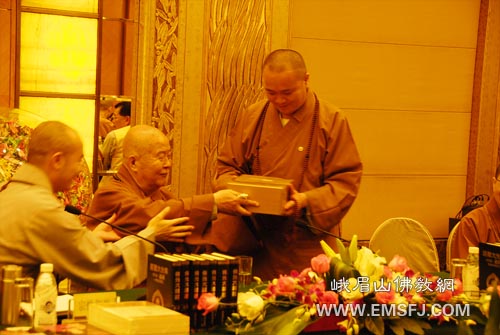 座谈会在热烈祥和的气氛中圆满结束。随后,星云大师代表台湾佛光山向四川峨眉山佛学院赠送了《佛光大藏经》一部,并向所有与会人员赠送了自己的部分著作。四川省佛教协会会长永寿法师也代表四川佛教界向星云大师赠送了礼品,祝愿大师四川之行平安圆满,希望能常来天府四川,普施甘露法雨,利益更多的众生。