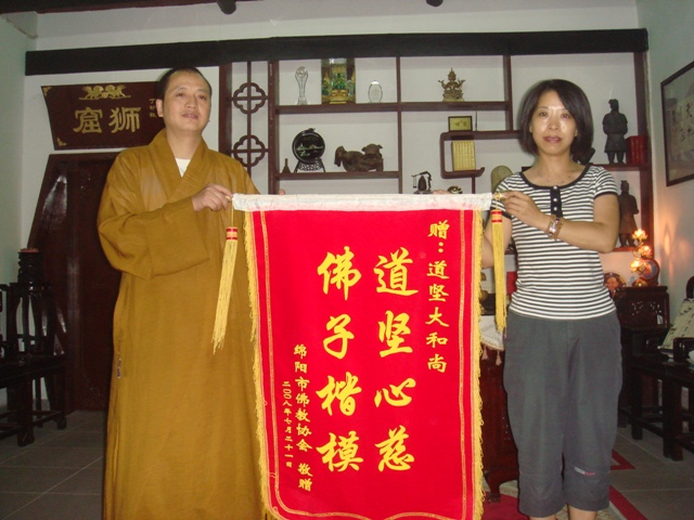 黄玲居士代表绵阳市佛教协会向道坚法师赠送锦旗