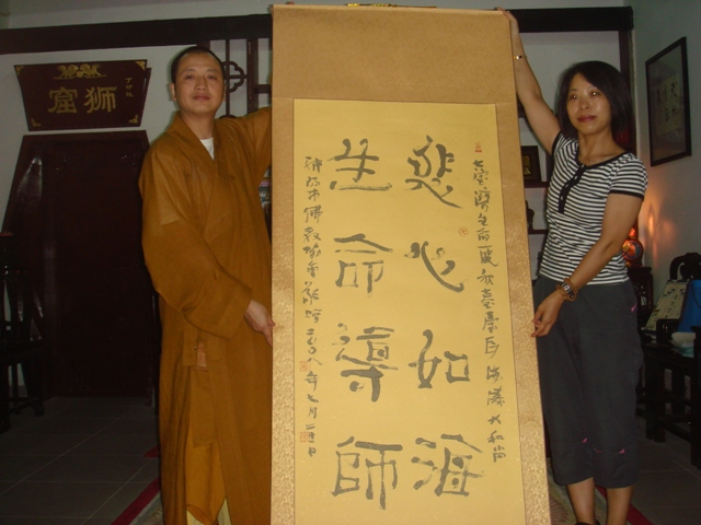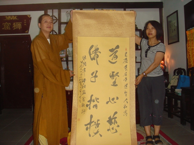 道坚法师代海涛法师接受字画(重庆华岩寺为台湾生命电视台赈灾联络处)