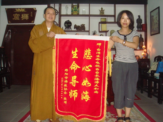 道坚法师代海涛法师接受锦旗(重庆华岩寺为台湾生命电视台赈灾联络处)