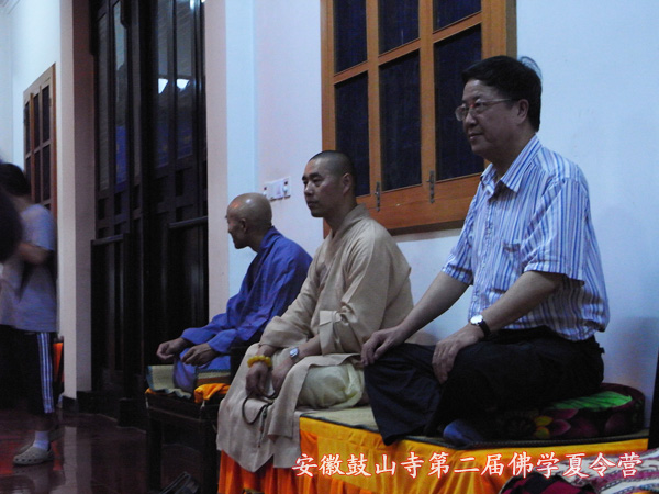 晚饭后一场小雷阵雨一扫天气的闷热,大家都跃跃欲试的期待着晚上的禅修,虽然知道打坐可能会腿子疼,但如果到了寺院不打坐那可就太遗憾了,所以在我们的一再要求下,晚上安排了绍云禅师带我们打坐参禅。前二十分钟我按照禅师说的止观方法坐禅,但渐渐地腿开始痛了,我尽量忍着,心里静不下来了。我换了一下腿继续用止观的方法入境。一个小时过去了,开静后站起来时感觉神清气爽。这是一次难得的体验,今后要每天抽出时间坚持坐禅。 (文字报导:男三组 组长)