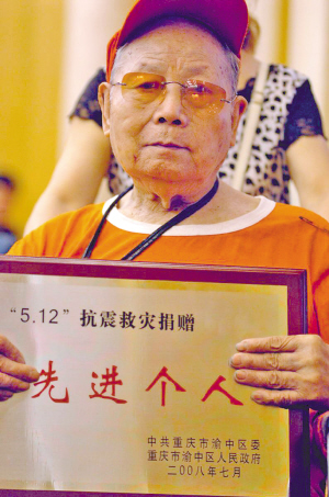 昨日,渝中区召开抗震救灾捐赠工作表彰会,13位市民和400余家单位获得表彰。93岁的残疾老人邱国卿捐款1万元,被评为“5·12抗震救灾先进救人”。