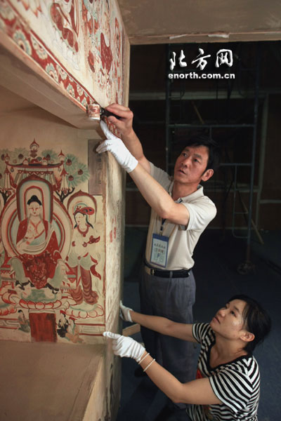布展工作从7月6日开始,目前正在紧张进行,到7月19日结束。负责布展的李晓玉向记者介绍说:“布展分阶段:一是洞窟模型的组装;二是壁画临本的装裱;三是给临本壁画做画框;四是展厅外墙的布置。装裱洞窟模型时,临本面积特别大,通常都是宽四五米,高度六米左右,布展的时候工作人员各有分工,出于保护文物的目的,大家都特别小心。天津展览以洞窟模型为主要展出内容,同时挑选了50幅临本壁画作品。展出的文物中,体积最大的就是158米的卧佛。”