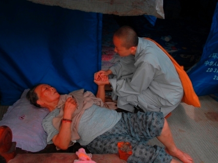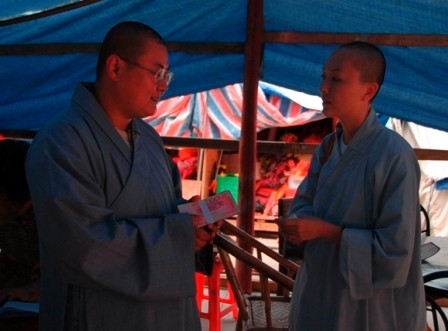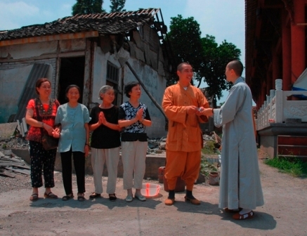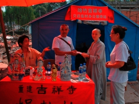 下午工作人员来到吉祥寺考察并捐款1万元帮助他们重建寺庙,过程中,工作人员还到附近的一道观考察他们的受灾情况并向他们送去了慰问金,信愿法师对道观负责人说,佛教和道教有着共同的慈悲济世精神,这次慰问希望你们能树立信心,尽早恢复。