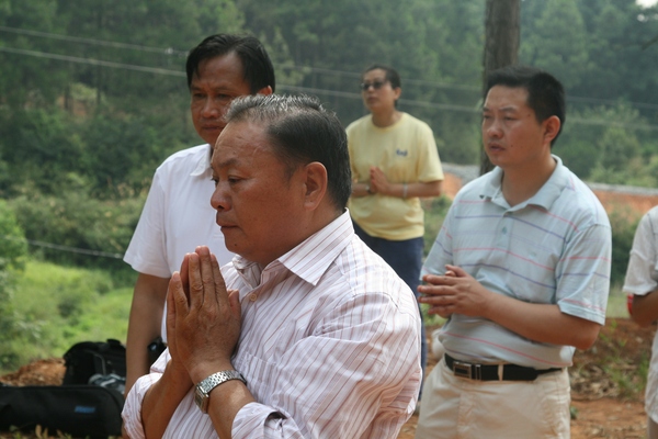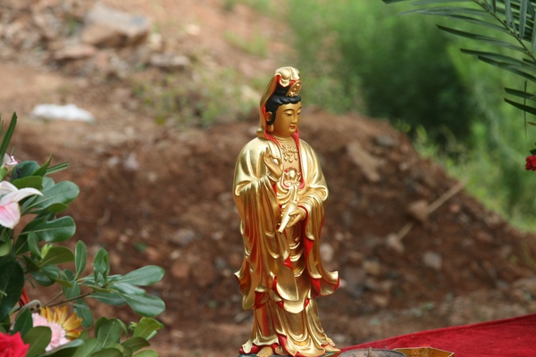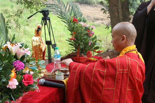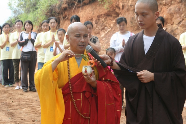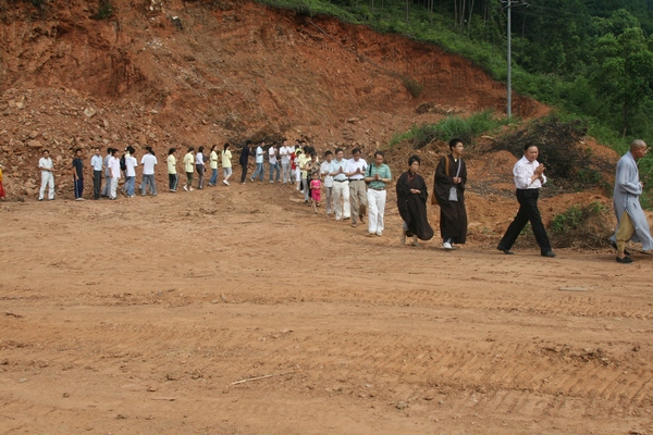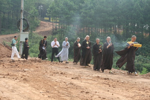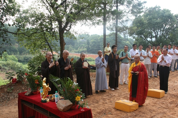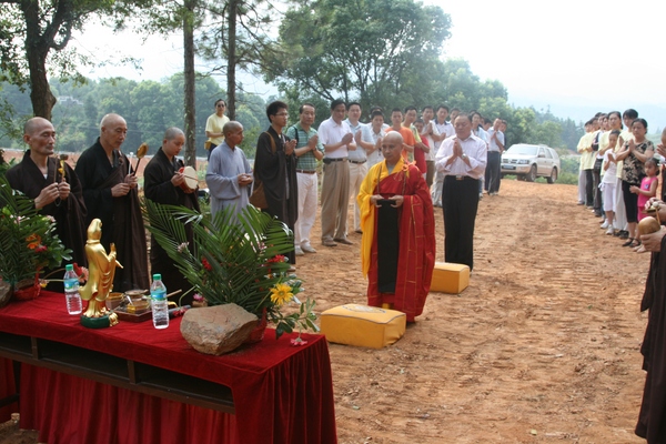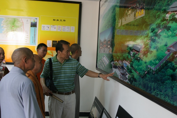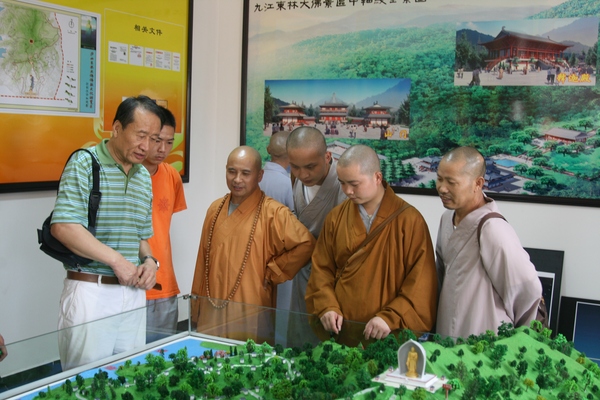 7月22日上午,东林寺首座和尚本通法师带领数位法师,前往大佛景区为三圣殿动工举行洒净仪式。之后,大佛工程的几位负责人陪同本通法师一行参观东林大佛建筑规划展厅。