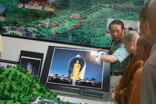 东林大佛工程总指挥密可水居士向大家介绍东林大佛景区的建筑与规划