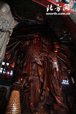 寺内大乘之阁内供奉着世界最大的金漆木雕大佛——千手千眼观世音菩萨,1999年入选世界吉尼斯纪录。大佛通高27.21米,腰围15米,重110吨,42只手臂,43只眼睛,堪称世界艺术瑰宝。