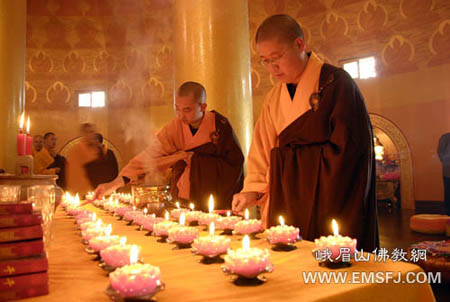 在峨眉山景区迎宾广场举行的欢迎仪式 峨眉山景区管委会主要负责人与考察团成员合影 法师们燃点心灯,上供十方诸佛菩萨 2008年7月14日,“台湾旅行商业同业总会考察团”一行共91人到峨眉山景区进行考察。据悉,考察团成员都是由台湾当地旅游业界人士以及当地的媒体代表组成,此行目的是为考察震后旅游路线,拉动震后四川旅游复苏。 7月15日,考察团一行前往峨眉山金顶考察、朝圣祈福,并参加了峨眉山金顶华藏寺举行的绕佛供佛祈愿法会。法会由峨眉山佛教协会会长永寿法师主法,峨眉山佛教协会秘书长宏开法师、金顶华藏寺监院传法法师等近百位法师参加了此次法会。全体团员欣喜跟随法师们礼拜、绕佛,共同祈愿世界和平,社会和谐,华夏和睦!