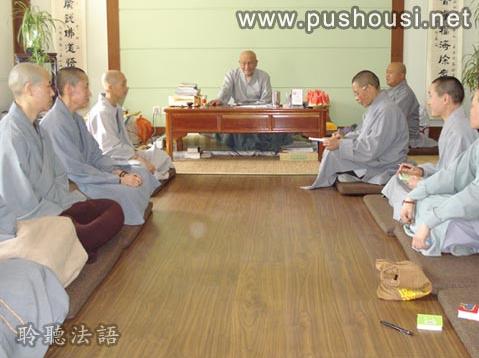 7月16号上午於院长办公室召开例行的寺委会及各部各堂口负责人会议,恰巧老和尚出来经行散步,如瑞法师请老和尚为大家开导几句。老和尚很高兴地与大家小坐,并开示了发心与做事的道理。