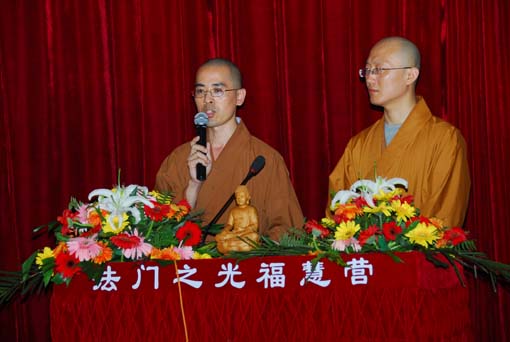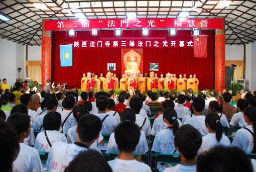 2008年7月15日晚7:30分,第三届“法门之光”福慧营开幕式在悠扬的梵呗声中拉开帷幕,参加本次开幕式的嘉宾有省市县多个部门领导和来自社会各界的著名人士。开幕式由道伟法师和慧超法师主持,首先进行洒净仪式,祈愿此次法会能得诸佛菩萨加持和龙天护佑。授旗仪式后,由法门寺监院智超法师致欢迎辞,向参加本次活动的人员表示最真诚热情的欢迎。接下来由嘉宾致辞,本次 “法门之光”福慧营得到了省、市、县各级领导的大力支持与帮助。最后学员庄严宣誓,在法门寺佛学院学僧威仪肃穆的“五方结界”表演中开幕式圆满结束。