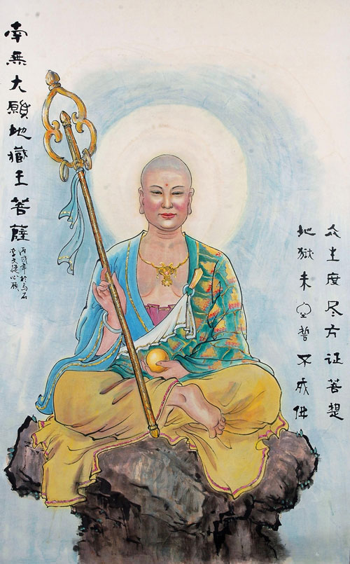 按佛教说法,地藏菩萨受释迦牟尼佛的托咐,在释迦寂灭后未来佛弥勒降生前这一段无佛世界里,担当起教化六道众生的重任,其地位相当于“代理佛”。《地藏本愿经》又说,释迦佛召地藏大士,令其永为幽明教主,使世人有亲者,皆得极本荐亲,共登极乐世界,地藏受此重托,遂在佛前立下宏大誓愿:“为是罪苦六道众生广设方便,尽令解脱,而我自身方成佛道。”(《地藏经·忉利天宫神通品第一》) 因此地藏又被称为“大愿地藏”,以与文殊的“大智”、普贤的“大行”、观音的“大悲”相呼应。
