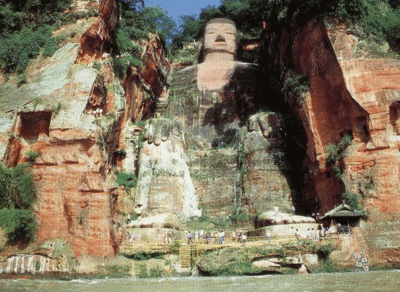 发源于川北大雪山的岷江,带着大量的雪水,滚滚南下。当它进入成都平原,来到乐山城下,已经是一条水面开阔的大江了。在这里,它同波涛汹涌的大渡河,水流湍急的青衣江汇合。就在这三江汇合得地方,坐着一尊世界上最大的佛像-乐山凌云大佛。