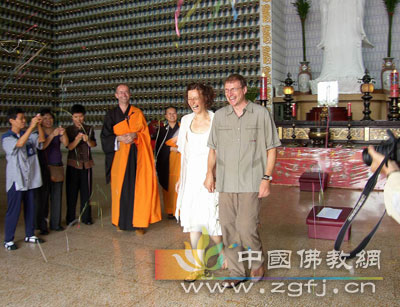 来自德国的Christoph Duchting和Nadja Khalaf,选择在北京奥运开幕典礼暨8月8日父亲节来到台湾佛光山,恭请该寺住持心培法师,为其举行简单而庄严的三皈五戒及婚礼。没有玫瑰花装饰的花拱门,没有热闹的结婚进行曲,没有大批的亲 友祝福团,更没有香槟庆祝,一切是如此的平凡而祥和。
