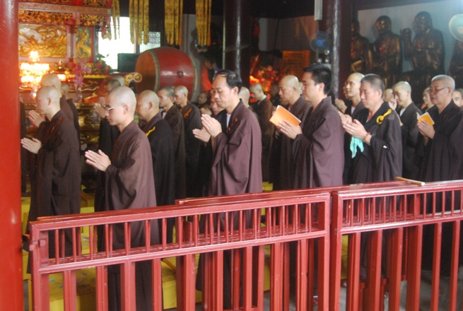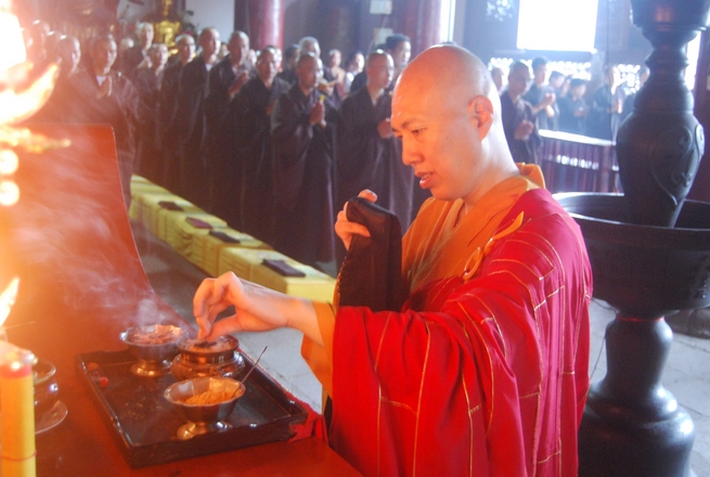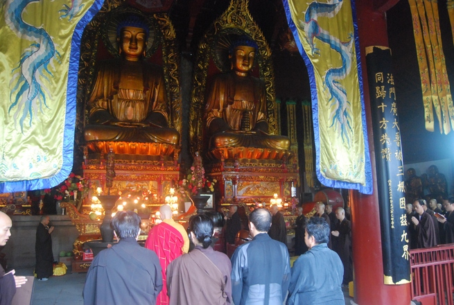 2008年8月15日(农历七月十五佛欢喜日)下午3:30,东林常住在大雄宝殿里举行了隆重的第七届“千亿圣号大念诵”回向法会。代方丈大安法师亲自主法,监院道元法师主持仪式,东林寺四众弟子随喜参加。