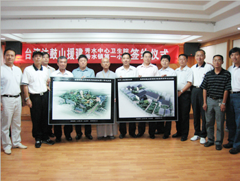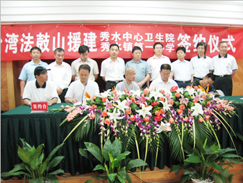 法鼓山援助川震民众重建家园,有了具体落实的行动。8月21日上午,法鼓山副住持兼四川救援团团长果品法师与四川省安县秀水第一中心小学、秀水中心卫生院,分别签订一千五百万人民币与一千六百万人民币的援建协议书,计画以一年六个月的工期,帮助秀水镇的小学师生与医护人员,打造安全、美丽、优质的学习与医疗环境。护法总会副总会长黄楚琪、法行会工程组江建平、易力行也特别自台湾前往关怀。