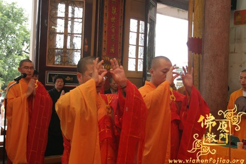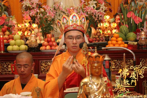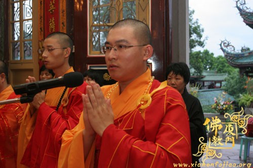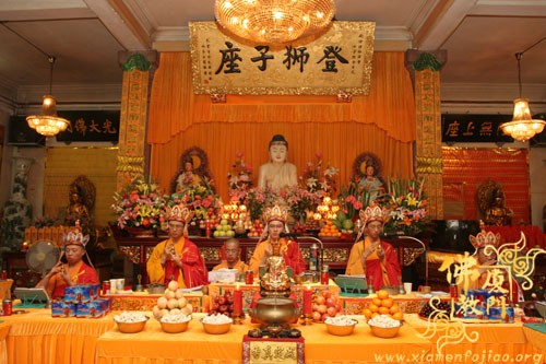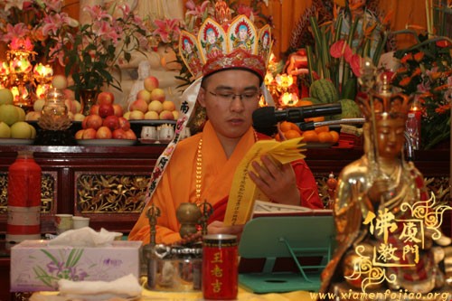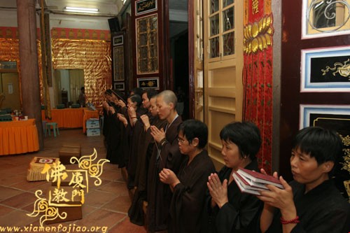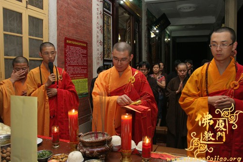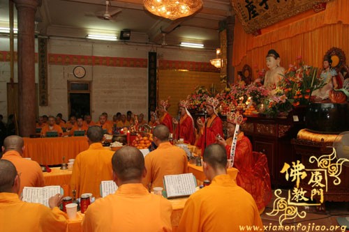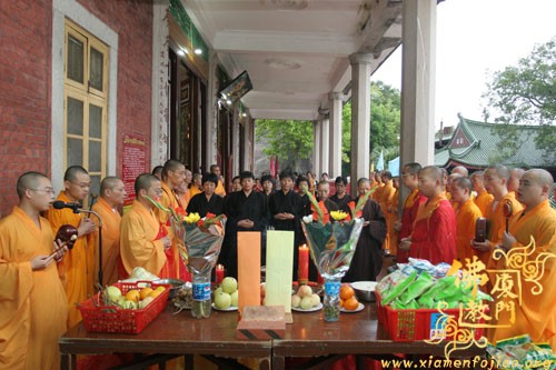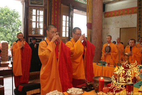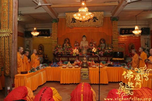 8月4日晚6时许,击鼓集众,在南普陀寺法堂施放五大士瑜伽焰口,礼请圆满法师、传航法师、清尚法师、道平法师、本藏法师五大士主法,斋主虔诚礼拜,4个多小时的诵咒、观想、说法、施食,荐拔幽冥众生离苦得乐、往生净土。