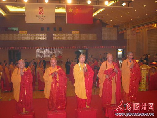 2008年8月6日上午9:30,上海玉佛禅寺全体僧众齐集觉群楼多功能厅,为北京奥运会举行了隆重、庄严的“众愿祈圆庆奥运”祈福大法会。来自全寺的僧众和本寺的部分护法居士,一起见证了这个神圣而庄严的时刻。