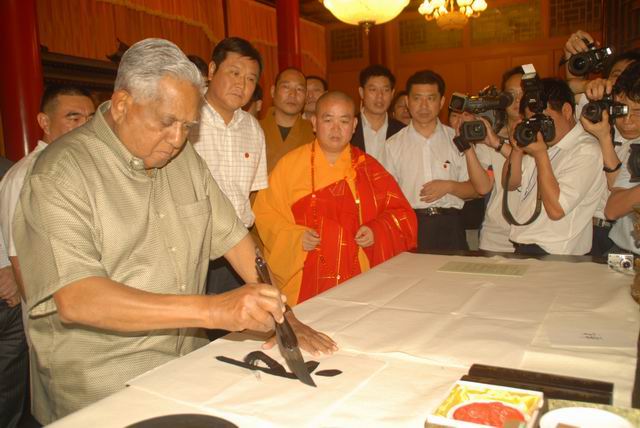 纳丹还高兴地拿起毛笔,用汉字书写一个大大的“禅”字和汉字签名,并盖上自己的印章。他临走时说:“这次参观时间太短,希望有时间再来少林寺做传统的禅修!”