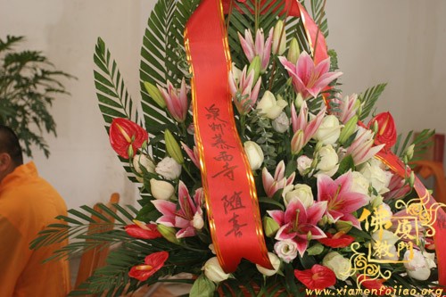 前来随喜参加法会有泉州少林寺、泉州慕西寺、厦门日光岩寺、厦门普光寺等寺庙代表和个人,并向进明寺赠送花篮,更增添法会庄严隆重的气氛。