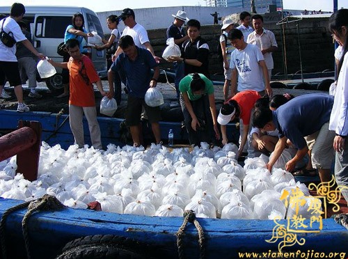 在报恩月里,闽南佛学院女众部法师组织了放生活动,17日,放生大众一行从第一码头乘船出发,在大兔屿海域放生2000万尾对虾,并为2000万尾对虾等生命皈依,忏悔,发愿,祝愿这些生命不再受网捕,同时也祝愿世界和平,战争永息。放生活动在法师与居士的和平祝愿中结束。