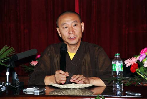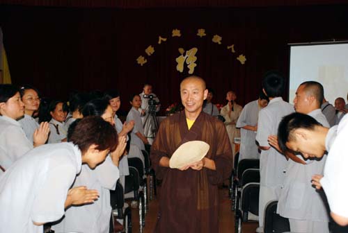 9点,北京朝阳寺明奘法师用手中的一把蒲扇为道具向大家生动地揭示《心经》中色与空的关系,使大家学会了如何正确地对待生活中的逆缘、顺缘。