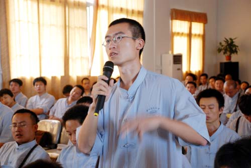 8月11日上午,伴随打板的号令,全体营员齐集慈云阁禅堂,在柏林禅寺佛学院教务长明影法师及五位比丘的带领下进行近一个小时的禅修。首先阐述了禅坐的意义,并教习大家如何数息等调心的方法,随后三位法师为大家示范跏趺坐的正确姿势。许多营员通过这次体验感受到了禅悦。