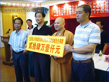 2008年8月20日上午,海南省三亚市残联举行慈善助残献爱心捐赠仪式,南山寺首座明生法师与李焕城居士为三亚农村贫困残疾人白内障患者复明手术捐赠24.1万元。三亚市副市长王诚安出席捐赠仪式,并代表市委、市政府对佛教界的慈善之举表示衷心的感谢和赞誉。