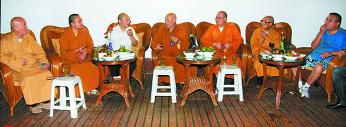 中国佛教协会理事、四川省佛教协会副会长、广德寺方丈海山大和尚,市文化旅游集团董事长骆常非,市文联主席周光宁,市宗教办主任杨军,广德寺监院普正法师,灵泉寺监院普能法师,广德、灵泉两寺高僧大德,中国观音故里旅游区有关负责人出席茶话会。市文化旅游集团副董事长卢加强主持茶话会。