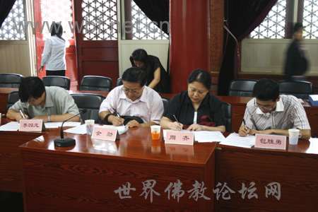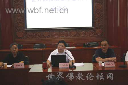 2008年9月18日下午,“世界佛教论坛课题研究”座谈会在京举行。4位在京课题评审组专家、12位在京课题负责人,中华宗教文化交流协会、中国佛协和无锡灵山书院有关负责人出席。中华宗教文化交流协会会长叶小文在座谈会上发表了讲话,与会专家学者、法师发表了意见。会议由中华宗教文化交流协会副会长兼秘书长齐晓飞主持。