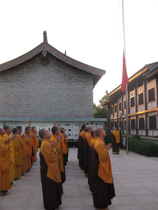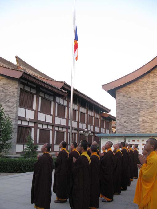 9月3日早晨6时,法门佛学院全体师生在佛学院广场举行升国旗、教旗仪式。在庄严的国歌声中,随着五星红旗和五色旗的冉冉升起,标致着美好一天的开始,同时也标致佛学院一个新的起点、新的开始。
