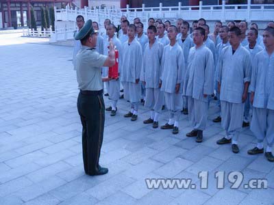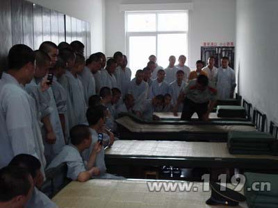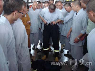 消防干警还组织培训的僧侣来到消防中队参加学习,利用消防站对外开放形式,讲解灭火器材使用方法,学习消防常识,扑救初起火灾的方法,有效地增强了僧侣的消防安全意识和预防、处置火灾的能力。