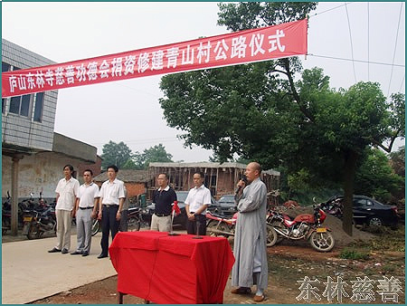 2008年8月27日上午,江西省九江市东林慈善功德会捐资修建庐山区海会镇青山村青王公路,并在青山村三解塘举行了捐赠仪式。东林慈善功德会镜义法师一行及九江市宗教局领导,青山村党委书记等人出席了捐赠仪式。此次功德会捐资的3万元,用于修建青山村至王家桥段的公路。