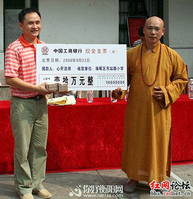 湖南雁雨寺住持心开法师捐赠10万元助国学教育