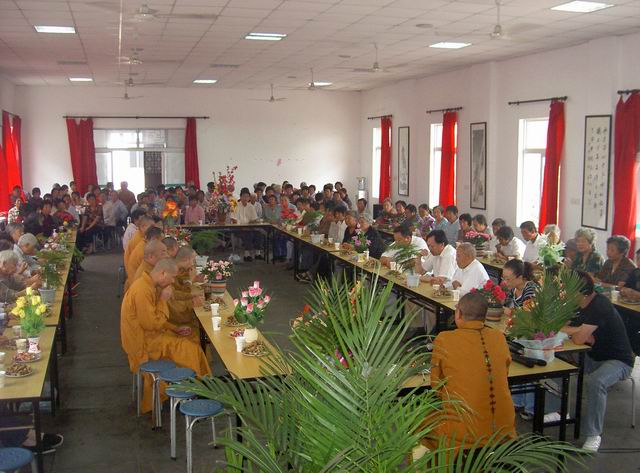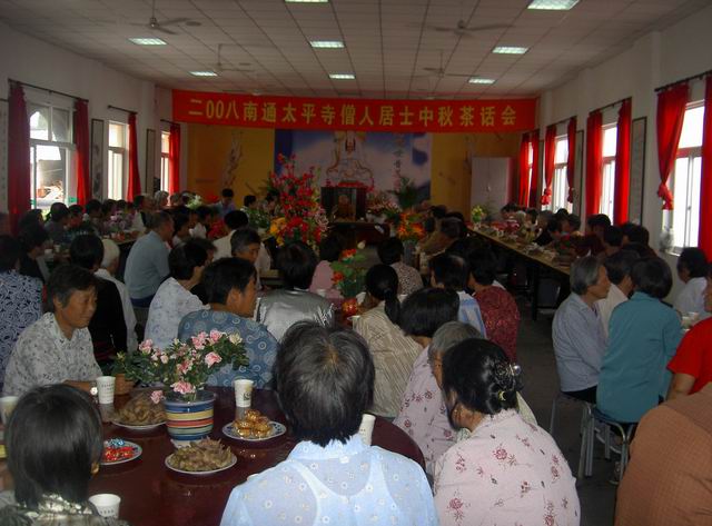 2008年9月12下午2时,江苏省南通市太平禅寺僧众及护法居士200余人齐聚大斋堂,共同举行欢度中秋茶话会。太平禅寺方丈文定法师做了开示,并就常住的硬件建设和内部管理等方面向大众进行了详细介绍。茶话会上,与会居士们积极发言,谈学佛心得和感想,并进行了精彩的表演。